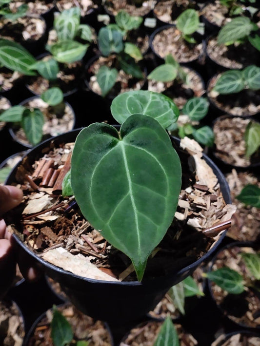 Anthurium papillilaminum × dressleri (same parents as Dark Phoenix) |