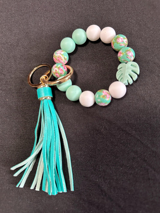 Beaded Plant Themed Key Chain. Elastic with metal links. Monstera Leaf
